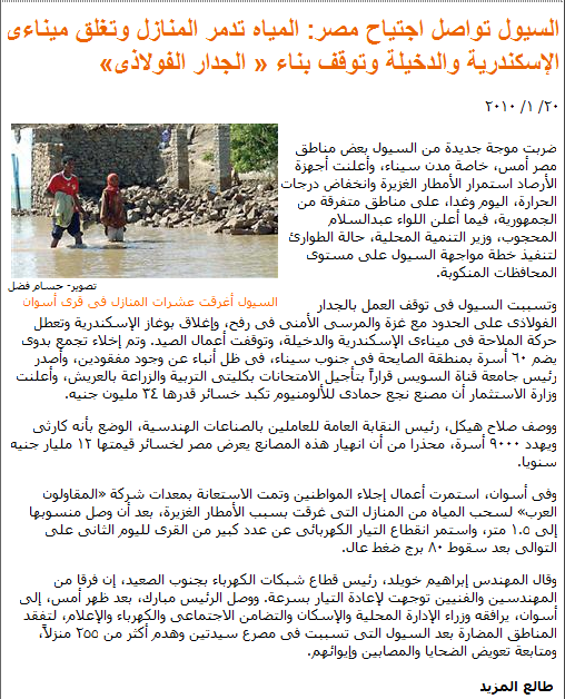 南部上エジプト電力会社地域部長イブラーヒーム・フワイリドは、技術者チームが早急に電力を復旧する、と述べた。ムバーラク大統領は、昨日夕、地域行政相、住民相、社会保障相、および電力相、広報相と共にアスワーンに到着し、女性二人が死亡し255以上の家屋倒壊の原因となった洪水の被害を受けた地域の視察を行った。犠牲者と被害者に補償し、保護を行う。