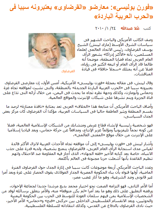 リンチが一昨日、アメリカの「フォーリン・ポリシー」誌の記事で語ったところではアル=カルダーウィーの反対者たちは、彼をこの地域における「アラブの新たなる冷たい戦争」の原因と考えている。この戦争は、ガザやハマースやアブー=マーゼン(訳注:ファタハのマハムード・アッバース議長のこと)に対する立場、そしてイェメンでの出来事についての彼の考えを巡り勃発したものだ。彼の意見はアル=ジャジーラで放送され、インターネットの世界中のサイトで広まっている。