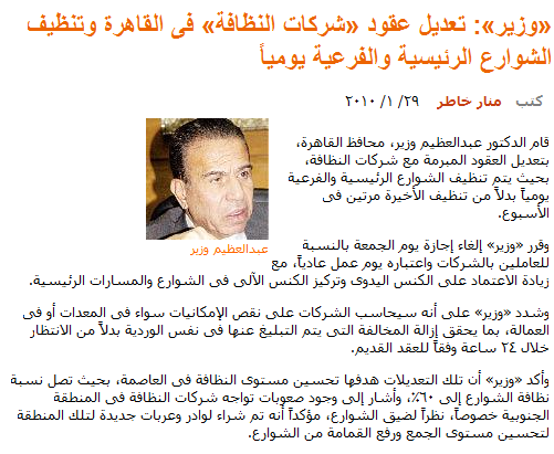 カイロ県知事アブドゥルアジーム・ワジール氏は、清掃会社との契約を最終的に更改し、幹線・支線道路について、以前のように週二日だけでなく、毎日清掃することとした。