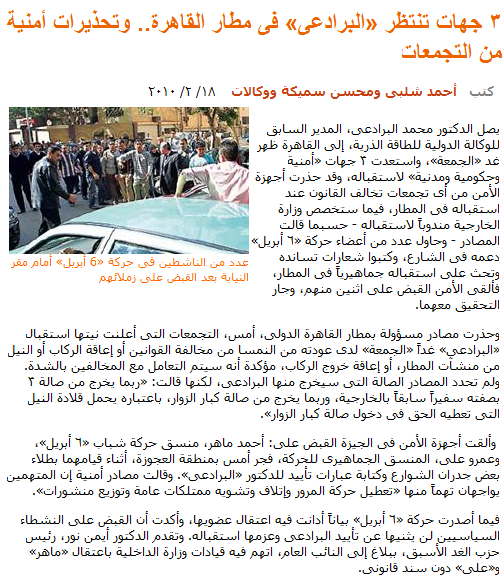 国際原子力機関前事務局長ムハンマド・イル=バラーダイーが、明日金曜日の午後カイロ空港に到着する。「治安、政府、市民」の三方面が彼を出迎え、治安機関は、空港での出迎えにおけるあらゆる違法な集まり対して警戒している。情報筋によると、外務省が出迎えの代表にあたるが、「四月六日」運動の多くのメンバーが彼への支援を通りで訴えようとし、彼を支持するスローガンを書き空港へ皆で出迎えに行くことを促したため、治安当局が二名を逮捕し、取調べが行われている。