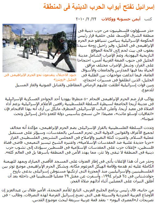 パレスチナ責任者らは、イスラエル首相ベンヤミン・ネタニヤフが、ヘブロンのイブラーヒーミー・モスクとバイトゥ・ラフム(ベツレヘム)にあるヤアクーブの妻ラヒールの墓を、ユダヤ歴史地区のリストに含める決定を下したことで、中東における宗教戦争の扉が開かれることを警告している。昨日、西岸地区南部のヘブロン市では、この決定に抗議しゼネストが行われ、学校、大学、公設市場など様々な生活拠点でストライキが実行された。ヘブロンで抗議デモを行った学生たちとイスラエル軍の間で衝突が起こり、イスラエル軍はゴム弾、スタングレネード、催涙ガスなどを使った。