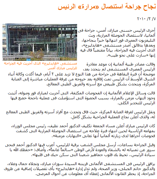 フスニー・ムバーラク大統領は昨日、ドイツで胆嚢除去の手術を受け、エジプトのテレビは、その終了直後に手術成功の知らせを報じた。その数分後、手術の行われたハイデルベルグ病院は、「手術はうまくいった」という短いコメントを発表した。