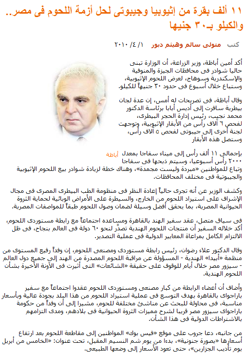 農業相アミーン・アザーバは、ギザ県、イル=ミナーフィーヤ県、アレキサンドリア県およびソハーグ県において、同省が現在、エチオピア産の食肉を販売する即売所を建設しており、一週間以内に販売開始され1キロ30ギニーを上限とする、と述べた。