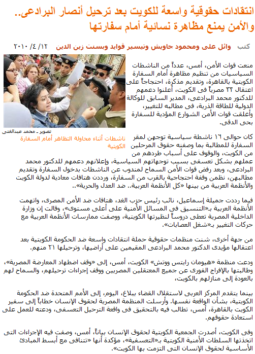 治安部隊は昨日、在カイロクウェート大使館前で多くの女性政治活動家らがデモを組織しようとしたのを止め、彼女たちの抗議文提出を阻んだ。これはクウェートで33人のエジプト人が逮捕されたことに抗議するもので、彼女たちは、国連原子力機関前事務局長ムハンマド・イル=バラーダイーの改革要求を支持していた。当局はドッキ地区の大使館へ通じる道を封鎖した。