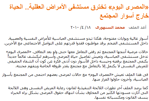 病的状態、これを生み出したのは社会だが、治癒後ですらこれとの関わりを拒んでいる。本紙はイル=アッバセーヤ病院に入り、患者とその家族の生活の細部を知り、新しい世界を暴き出した。これは、社会が拒否することで事足れりとし、精神病者の真の治癒は社会がその個別の事情を評価し苦痛を理解することでしか有り得ないことについて、少しの考えも巡らせずに塀の中に押し込んでいるものだ。