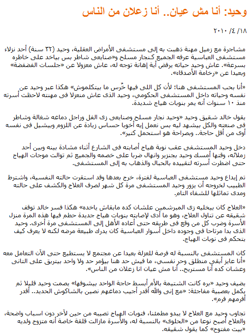 「治療は彼を鋲で打ち付けられたようにしてしまった。だから通わなくなったんだ」。このようにハーリドは治療の中断を説明した。これが新たな発作につながり、今度は家族の家が破壊され、居合わせたすべての人が殴られ、また病院に戻ることになった。イル=アッバセーヤの塀の中にいる時、ワヒードはリラックスして見え、病気の性質を理解していたが、どうやって激昂発作をコントロールするのかはわからなかった。