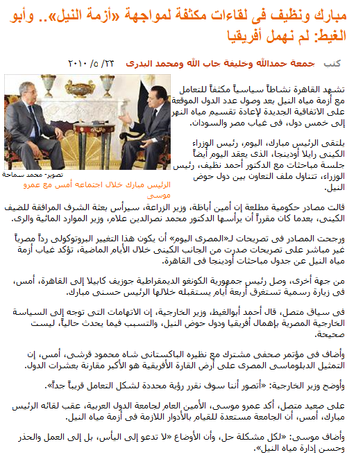 一方、アラブ連盟事務総長アムル・ムーサーは昨日、ムバーラク大統領との会見の直後に、ナイル水利問題で、連盟には必要な対応を取る用意があることを述べた。